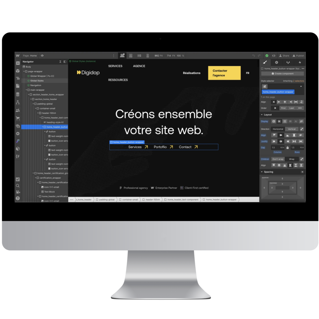 Webflow permet de concevoir et visualiser chaque page en temps réel grâce à son éditeur visuel intuitif. Chaque élément, de la typographie aux animations, peut être ajusté pour créer un design unique et captivant.